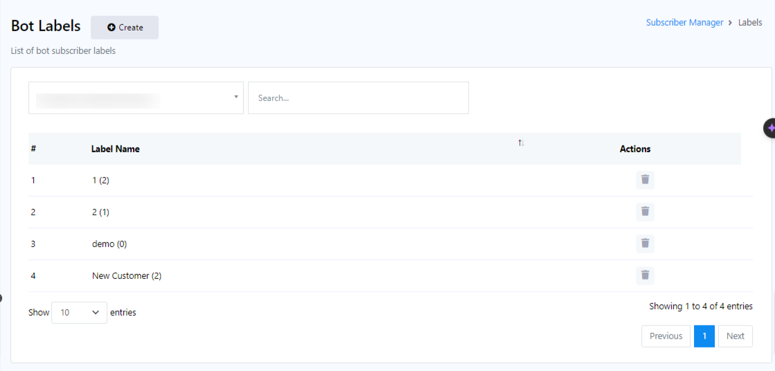 From the Bot Label, click on the `Create` button to create a new label. A pop-up form will appear with two fields: `Label Name` and `Select Bot`.